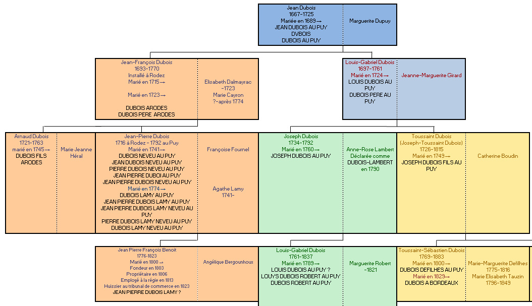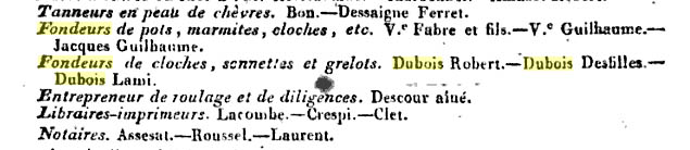 Son fils Toussaint-Sébastien Dubois (1769-1862) se marie avec Marie-Marguerite Defilhes en 1800. En 1809, ils figurent comme DUBOIS DESFILLES, fondeurs de cloches, sonnettes et grelots.