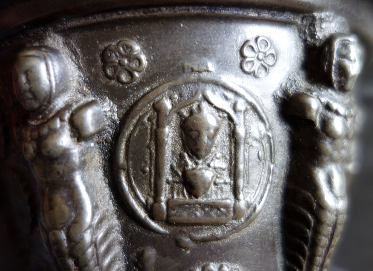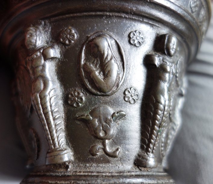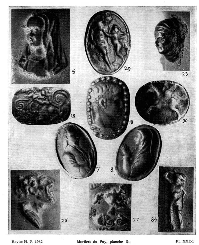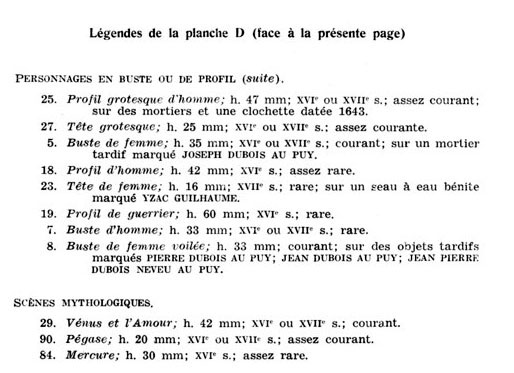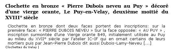 Certaines clochettes signées PIERRE DUBOIS NEVEU AU PUY sont ornées de la vierge orante, motif étudié par les spécialistes des mortiers, Ollivier Ramousse, Guillaume Convert et Roger Gounot.
