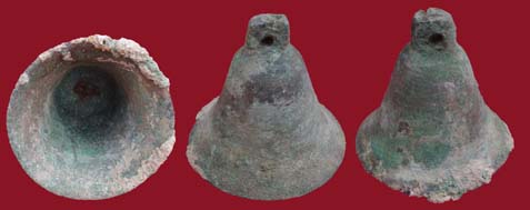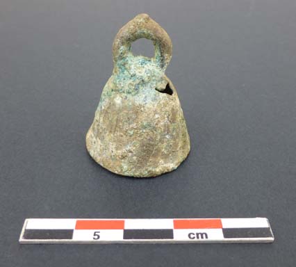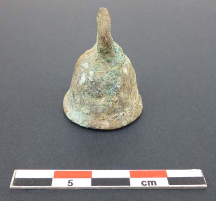 La petite clochette en bronze trouvée en 2012 en Ardèche, dans un contexte stratigraphique certain entre XII et XIIIeme siècles, mesure 35 mm de hauteur pour un diamètre à la bouche de 28 mm. L’iconographie des chevaux ensonnaillés, l’environnement minier du site et la pratique traditionnelle permettent d’émettre l’hypothèse d’une clochette faisant partie d’un ensemble placé sur le collier d’un équidé : cheval, âne, mule, mulet. Aujourd’hui, cette petite clochette est parfois placée au bas d’une grelotière.