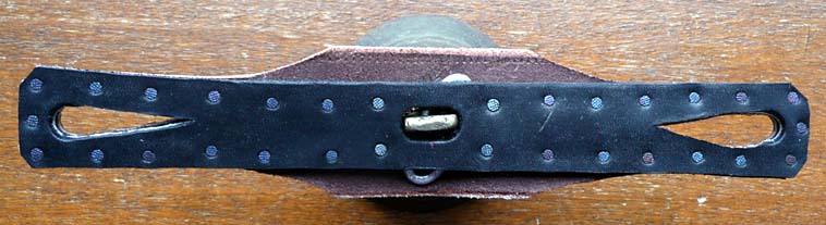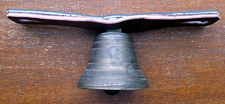 Le battant conique, en métal forgé, s’enroule directement sur la bélière. Par sa longueur, il dépasse d’un centimètre sous la bouche aussi nommée jupe. La bélière (aussi nommée boucle, porte-battant, colombelle) et l’anse (ganse) sont forgées d’une seule pièce qui passe à travers le cerveau dans deux trous de 5 millimètres de diamètre. Un renfort incrusté par forgeage est aménagé à l’extérieur de l’anse, il était fixé (soudé ?) sur les épaules.