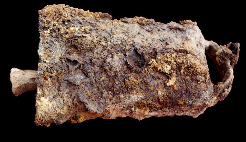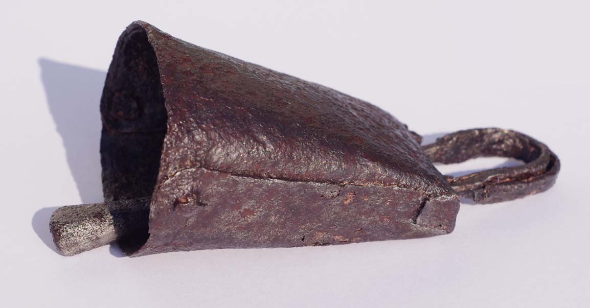 La sonnaille en tôle de Lazer (Hautes-Alpes) présente des traces de brasage et a conservé son battant en os. (Fouille préventive d’Arkémine sous la responsabilité scientifique de Mathilde Tissot).