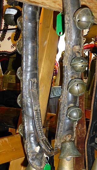 La clochette en bronze coulé, également découverte à Lazer, est un modèle à piquet (anse percée d’un simple trou) sur lequel on place une lanière en cuir (conjuscle) qui se fixe sur le collier en bois de la bête.