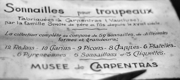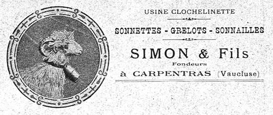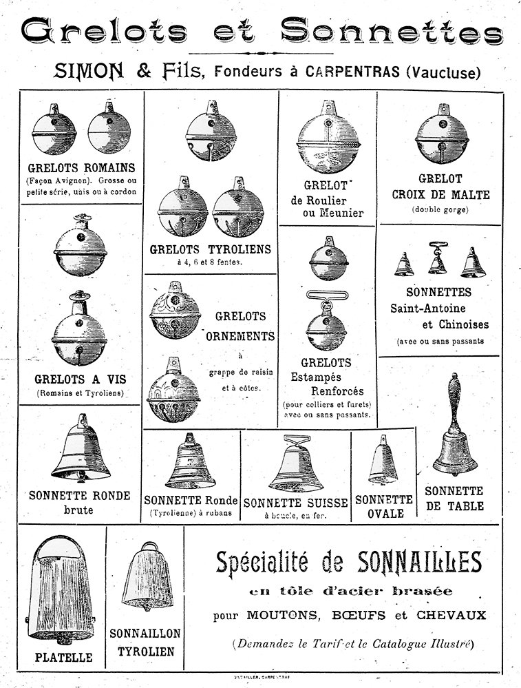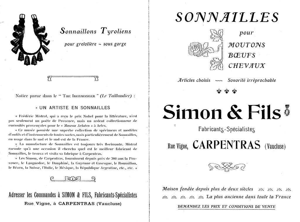 « Sonnailles provençales, Les Simon, artisans carpentrassiens » par Robert Caillet, Conservateur de la bibliothèque Inguimbertine et du musée de Carpentras, dans Revue de Folklore Français et de Folklore Colonial. – Tome XIII – N° 3 – Juillet/Septembre 1942.