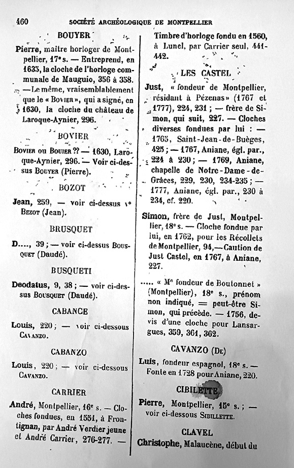 Just CASTEL, fondeur de Montpellier, résidant à Pézenas, est mentionné en 1765 (cloche de l’église de Saint-Jean-de-Buèges), 1767 (refonte de deux cloches et du timbre de l’horloge pour Aniane), 1769, 1775, 1778, 1782 (fonte d’une cloche pour La Coste). Mort en 1784. Source : Jean Nougaret, Etudes Héraultaises, Notes d’archéologie campanaire, 1970.