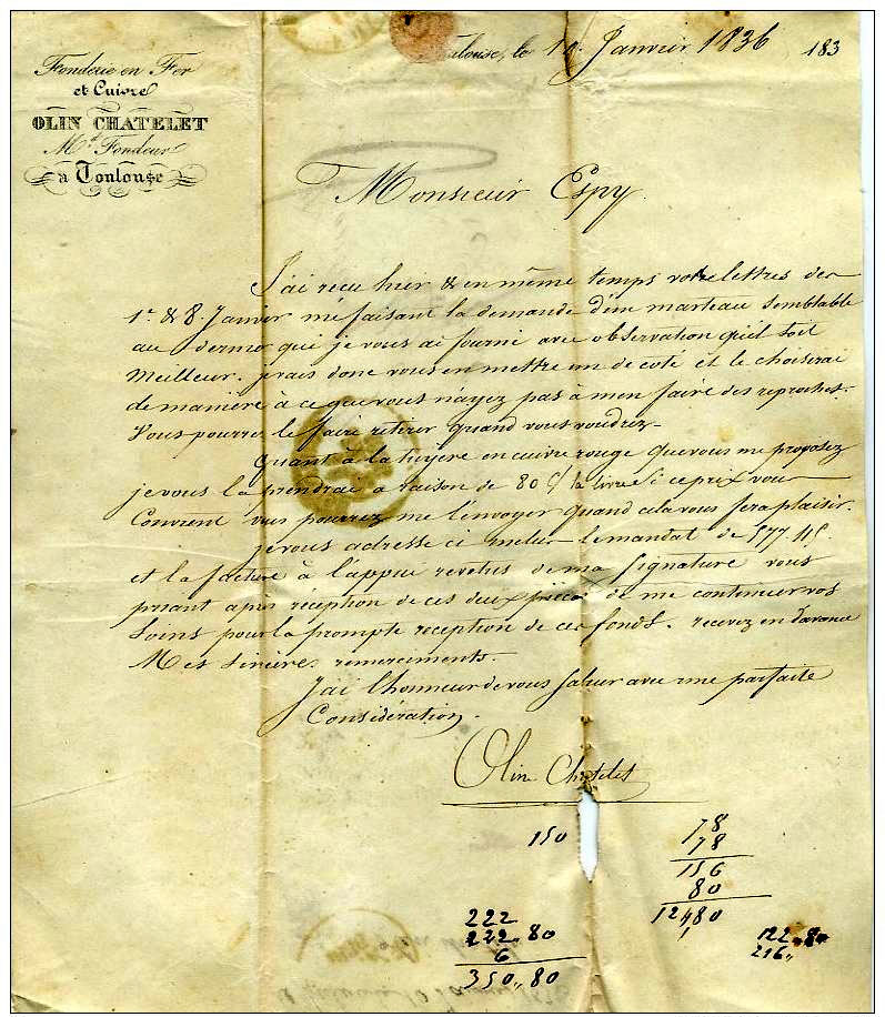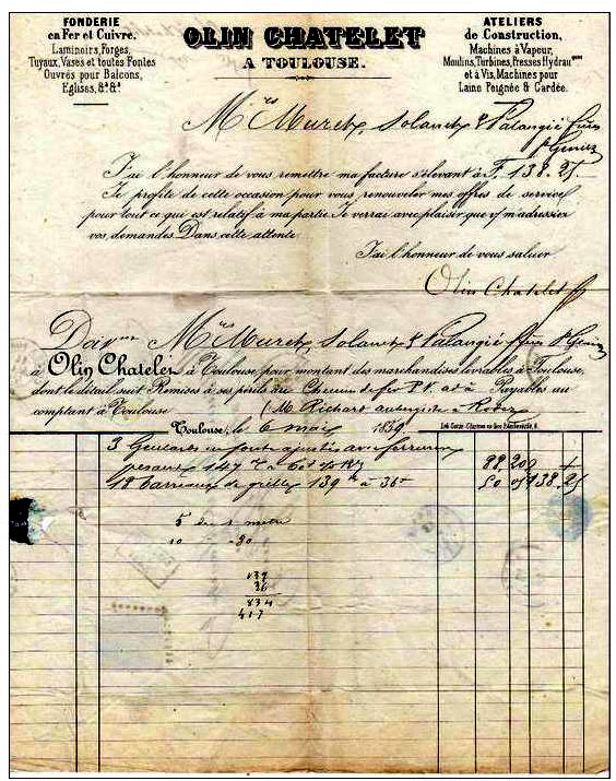 Joseph Chatelet signe des cloches d’église JOSEPH CHATELET A TOULOUSE entre 1778 et 1806 PUIS CHATELET PERE ET FILS entre 1803 et 1811, probablement avec son fils Pierre Chatelet indiqué comme fondeur en 1820, sur l’acte de mariage de sa fille Marie Josephe Chatelet , document où l’on voit les signatures de Marie Chatelet (Marie Josephe) Chatelet fils (Pierre Chatelet) et Chatélét (Joseph Chatelet). L’entreprise profite largement des guerres napoléoniennes. Elle est reprise en 1820 par le mari de Marie Josephe Chatelet, Jean Nicolas Olin (1795-1857), fils du fondeur de Sedan Jacques Eustache Xavier Olin (vers 1763-1837), sous l’intitulé d’Olin-Chatelet qui a fondu des cloches entre 1851 et 1862 (source SFC), mais n’a pas signé de sonnailles. Il travaille avec son frère Xavier Olin (Jacques Auguste Xavier), né en 1800 qui se marie en 1831 avec Jeanne Costes, nièce du fondeur de Villefranche Pierre Costes. Ils vivent dans la même maison (même adresse).
