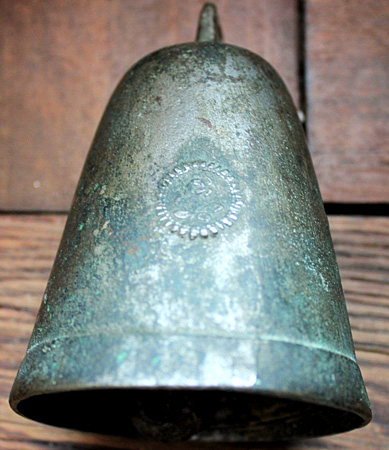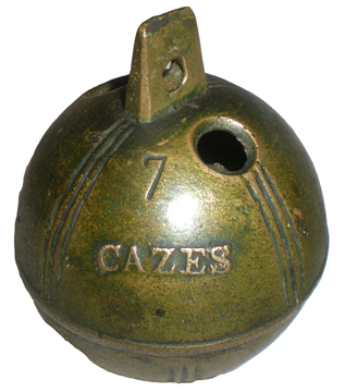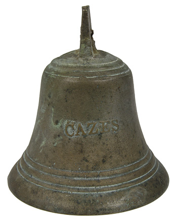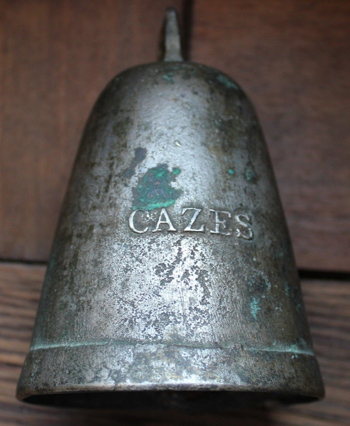 Les fondeurs Cazes sont actifs entre 1820 et 1928, associés entre frères et avec les Triadou, Pourcel et Vergnes. La signature CAZES seule est très rare sur les cloches d’église. La rose cerclée de dentelures (pastillage) se retrouve identique sur plusieurs sonnailles et sonnettes marquées de différents noms. Il semble donc que Cazes réalisait des clochettes commandées par des particuliers, éleveurs ou revendeurs, mais apposait sa rose comme marque anonyme.