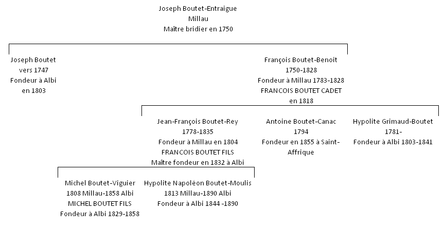 Jean-François (1778-1835), fils de François Boutet (1750-1828), travaille probablement avec son père lorsqu’il se marie à Millau en 1804. Il signe François Boutet fils. Ses enfants naissent en Aveyron en 1808 et 1813. Il déménage à Albi où il est maître fondeur en 1832.