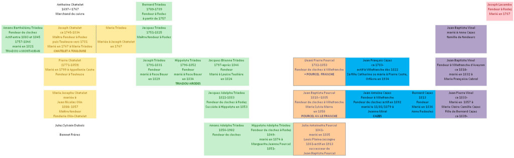 Les fondeurs Triadou de Rodez, Chatelet de Rodez et Toulouse, Lévèque (Levesque) de Montauban, Pourcel, Cazes, Costes, Vinel de Villefranche, Lacombe de Rodez concluent des alliances matrimoniales et s’associent souvent dans la fonte de cloches. Pour une généalogie documentée, on se reportera à notre compte Geneanet :Fabricants de sonnailles qui bénéficie des échanges avec Bruno Muratet.