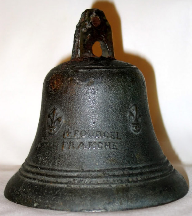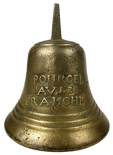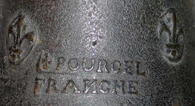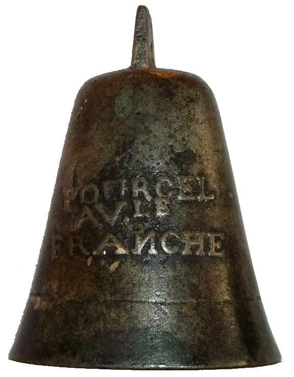 Les sonnailles, ou cloches à main, avec les fleurs de lys et la signature + POURCEL  FRANCHE, sont plutôt l’oeuvre de(Jean) Pierre Pourcel (1782-1858) entre 1815 (Restauration) et 1839 date de l’apparition de la signature POURCEL PERE ET FILS sur les cloches d’église. Ce fils,Jean Baptiste Pourcel, actif entre 1839 et 1891 a signé seul les cloches de Millau en 1880. On peut probablement lui attribuer les sonnailles marquées POURCEL AV.LE FRANCHE décorées avec une médaille usagée de saint Louis Gonzague (Italie, 1568-1591).