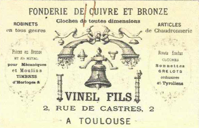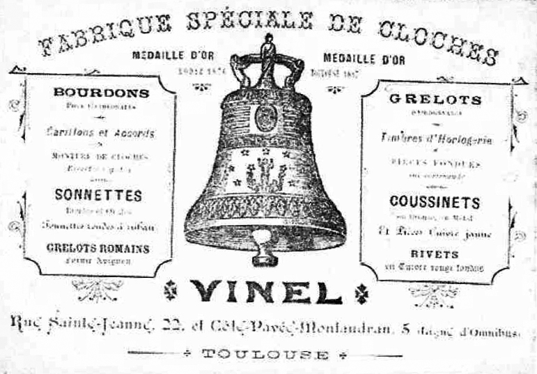Les fondeurs de cloches d’églises Vinel sont actifs à Toulouse de 1863 à 1953. Mais des Vinel sont indiqués plus tôt comme fondeurs dans leurs actes de mariage à Villefranche d’Aveyron. On relève de fréquentes alliances avec des filles Cazes. Jean-Pierre Vinel (1832-1908) aurait, selon Sophie Vinel, succédé à son beau-père Bernard Cazes, dernier fondeur de la lignée.