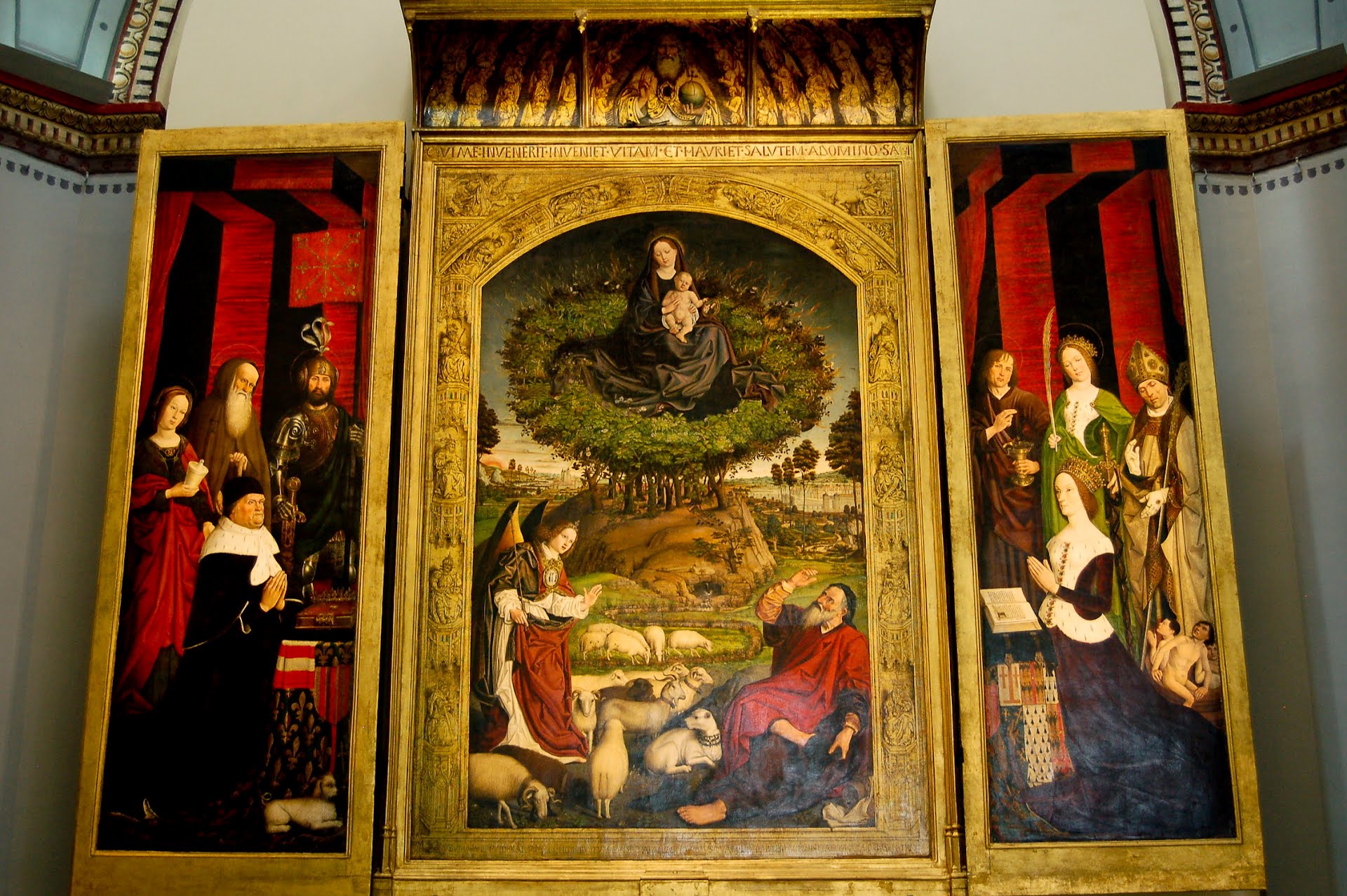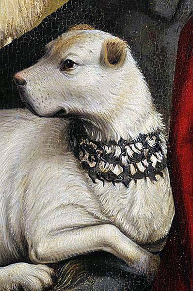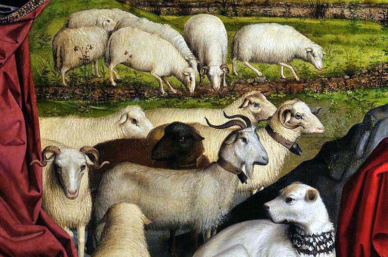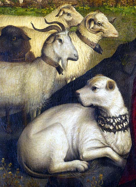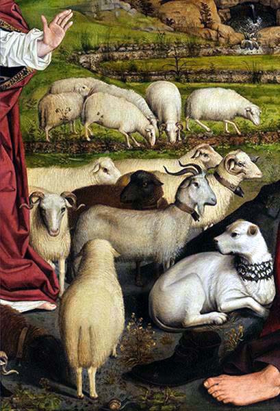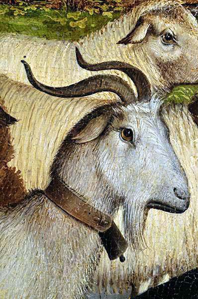 Le Triptyque du Buisson ardent peint par Nicolas Froment en 1475 conservé à la cathédrale d’Aix-en-Provence montre deux béliers portant des redons non bordés et une chèvre (bouc ?) avec un picon monté sur un collier lyre où apparaît distinctement la clavette et l’extrémité de la conjuscle. Photographies Jean BERNARD ©
