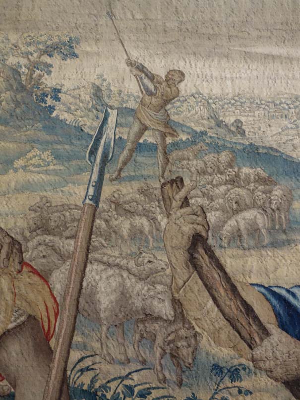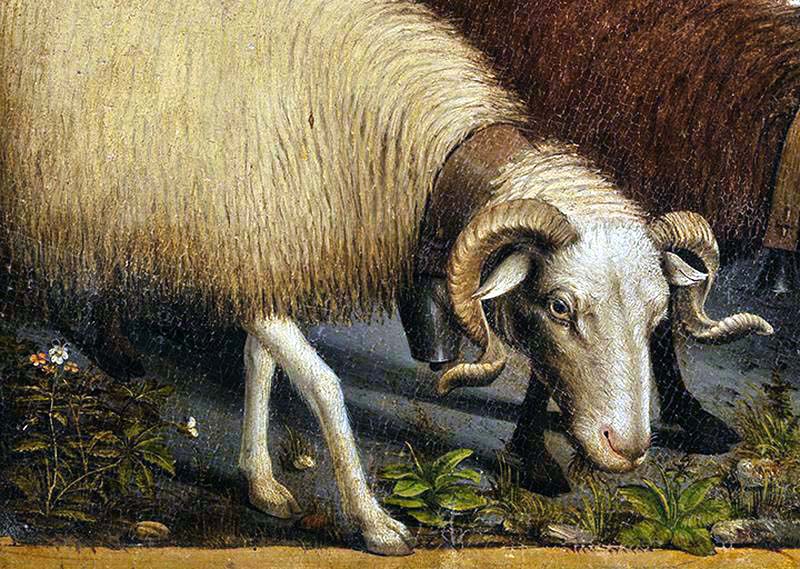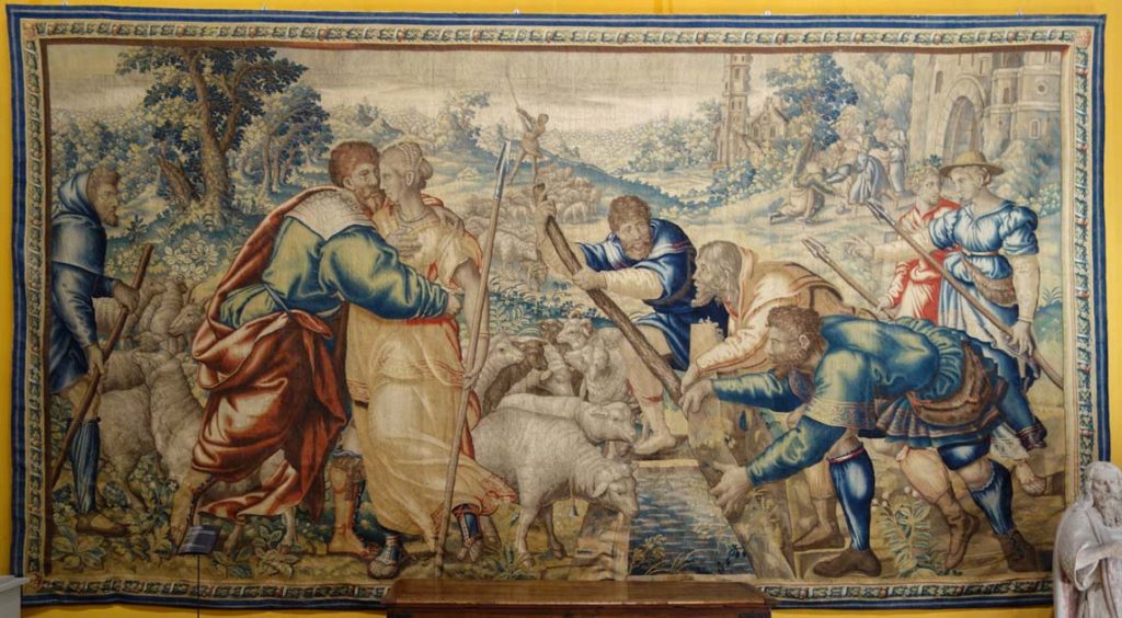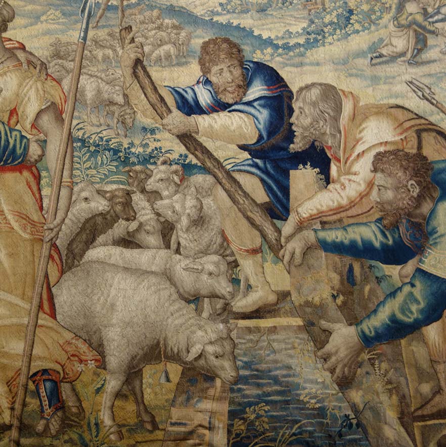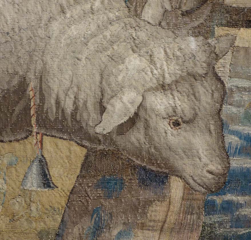 Une tapisserie exposée aux Hospices de Beaune (Bruxelles, fin XVIe-début XVIIe siècle) illustre la rencontre entre Jacob et Rachel venue faire abreuver ses brebis. L’une d’elle porte une clochette à piquet conique suspendue par un cordon. On remarque les deux outils du berger, souvent confondus par les iconographes et même par les rédacteurs de cartels des expositions : le crochet qui sert à attraper la bête par la patte et la houlette, sorte de cuillère allongée avec laquelle on prend de la terre qu’on envoie à la figure de la brebis pour l’éloigner d’une limite.