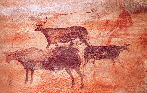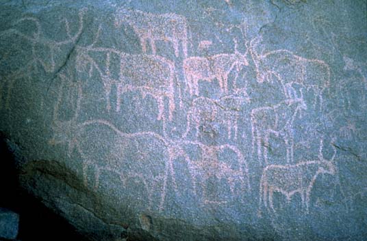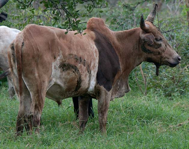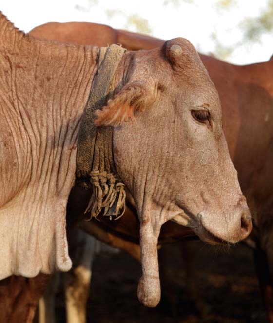 <<Il y a beaucoup d’images similaires au Sahara, et elles sont regroupées sous l’appellation générique de « pendeloques sous-jugulaires. » On y a parfois vu des amulettes, mais le plus probable est de les rapprocher de la tradition (de la Corne de l’Afrique) qui consiste à découper le fanon des bovins en ne laissant en réserve que des lambeaux de peau. Je joins deux photos qui représentent cela. Je précise qu’il peut y avoir une ou plusieurs pendeloques de ce type. Je doute donc fort qu’il s’agisse de sonnailles.>>
