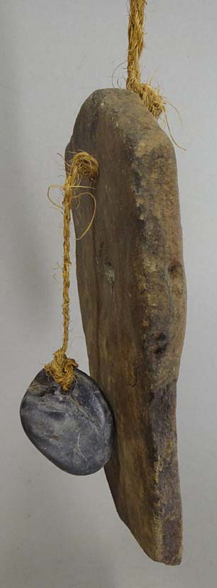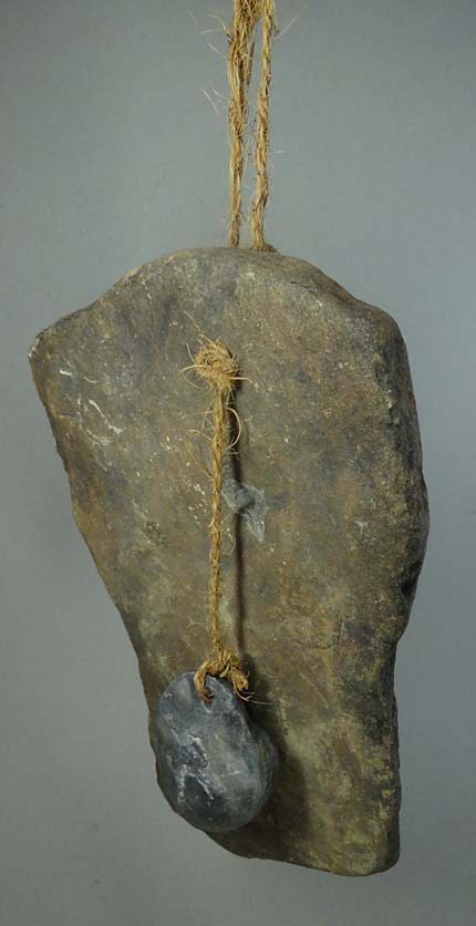 <<La moitié des vaches à grandes cornes sur ma photo (et d’autres que j’ai trouvées dans des illustrations de livres du Sahara) ont une ligne droite au cou, donc un collier, une corde qui porte un objet plutôt volumineux que droit. Comme dans cette région volcanique on trouve partout des pierres sonores, je me suis permis de formuler l’hypothèse, que les armaillis néolithiques ont attaché des pierres sonores au cou de leur bétail. L’expérience fonctionne parfaitement, le son de deux pierres qui tappent l’une contre l’autre porte assez loin. Sur la photo que j’ajoute à ce courriel vous pouvez voir un caillou, fixé à une corde qui frappe contre une pierre sonore que j’avais ramenée du Hoggar. Cet ensemble tinte et peut être appelé « sonnaille ». >>