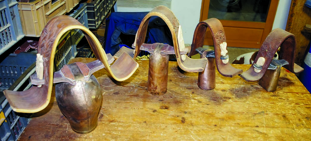 Les quatre sonnailles de la tradition provençale et leurs colliers lyre, de gauche à droite : redon, pique, clavelas, platelle.