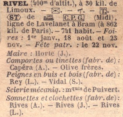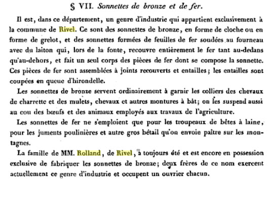 En 1818, Claude-Joseph Trouvé (baron) dans sa « Description générale et stastistique du département de l’Aude » dit que l’industrie des sonnettes est un genre d’industrie qui appartient exclusivement à Rivel. Les frères Rolland ont toujours été en possession exclusive de fabriquer des clochettes en bronze. Les familles Dilhat et Olive en possession exclusive de fabriquer des cloches en fer. Il semble qu’il faille comprendre par « exclusive », la connaissance du laitonnage des sonnettes, plutôt que le privilège. Il raconte qu’un maréchal-ferrand qui les aurait aidés, aurait saisi le procédé de fabrication et se serait installé à son compte. Il s’agit probablement d’un Rives, mais lequel et de quelle famille ? Plusieurs d’entre-eux exerçaient la profession de maréchal-ferrand.