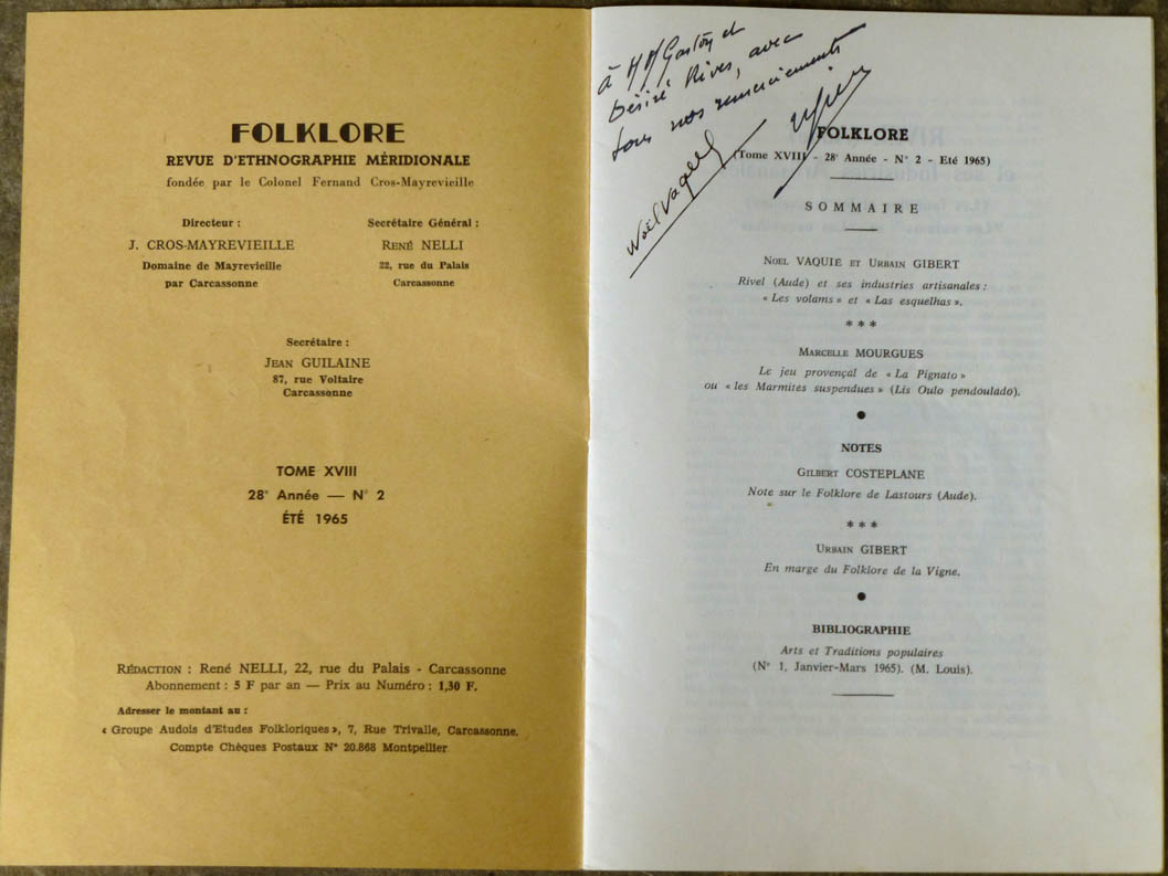 Cette même année, Noël Vaquier et Urbain Gibert publiaient « Rivel (Aude) et ses industries artisanales : les volans et las esquelhas » dans la revue Folklore.