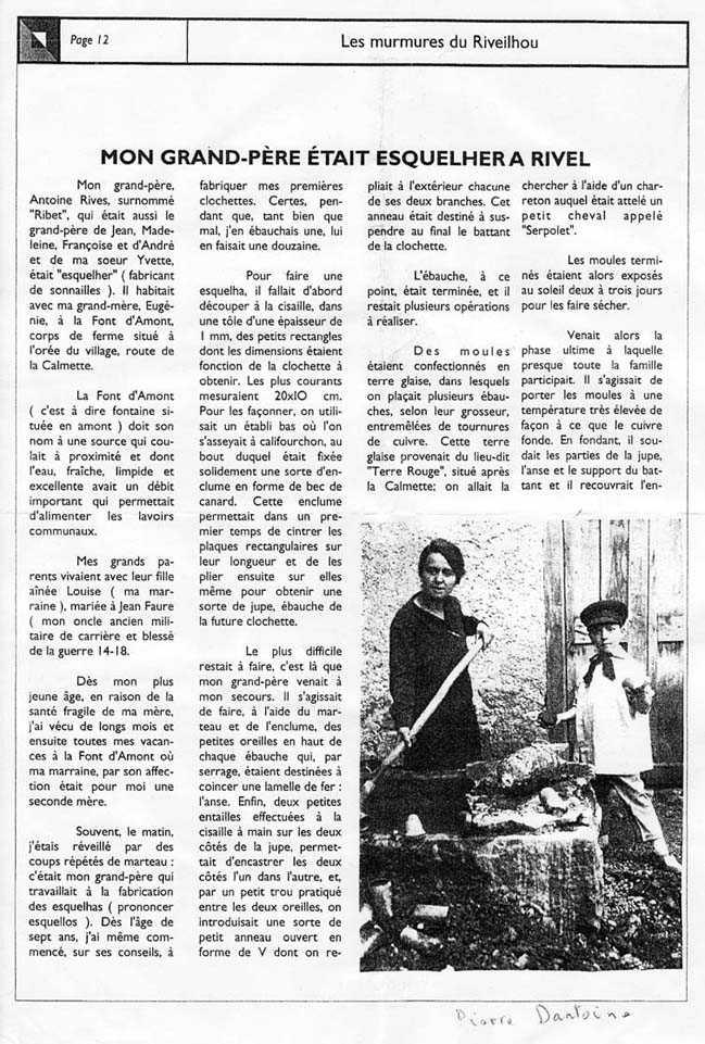 Pierre Dantoine, petit-fils d’Antoine Rives a publié dans « Les murmures  du Riveilhou, Mon grand-père était esquelher à Rivel » N°22 page 12.