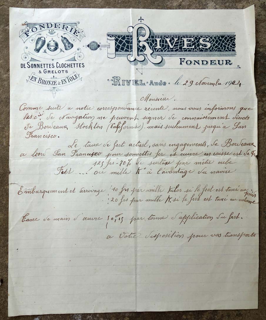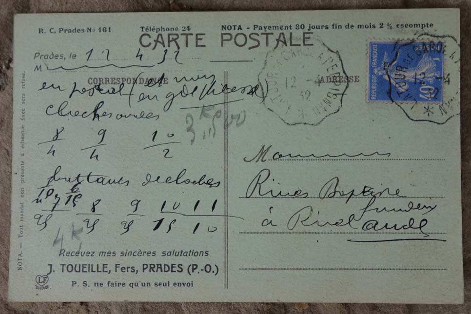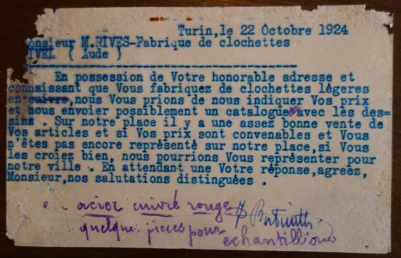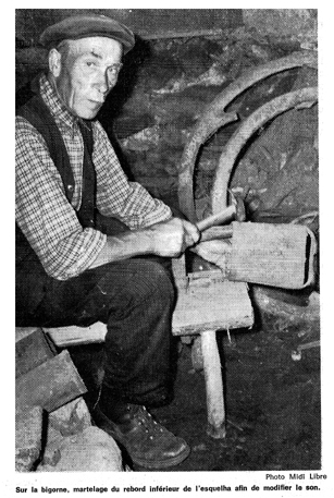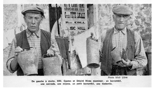 En 1820, Pierre Rives, surnommé « Pampourret », fabrique des cloches. Baptiste Rives (1840-1929) puis Jean-Baptiste (1866-1933) appelé Baptiste continuent l’activité. Gaston Rives (1898-1987) et Désiré Rives (1904-1983), père de Mimie Rives notre informatrice, ont cessé l’activité d’esquelher en 1953. Ils mènent avec Jean Rives, la visite des ateliers pour l’article du Midi Libre en 1965. Parallèlement, ils exerçaient la profession d’agriculteur.