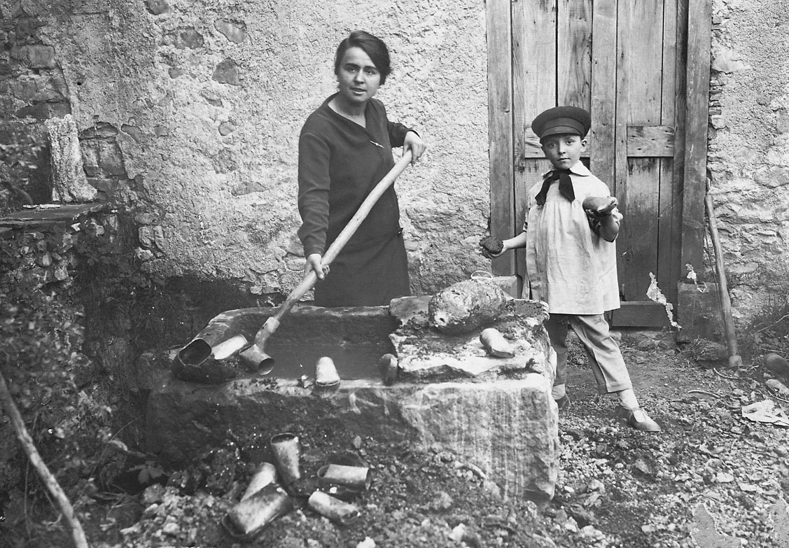 Justine Rives (1899-1983), fille d’Antoine Rives et son neveu Pierre Dantoine lors de l’opération qui consiste à jeter les moules dans l’eau.