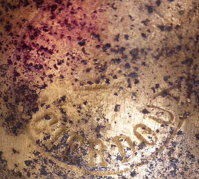 Détail de la marque obtenu par traitement photographique : ACIERDOUX en bas, GU (?) en haut. Peut-être un fabricant à rechercher à Toulouse.